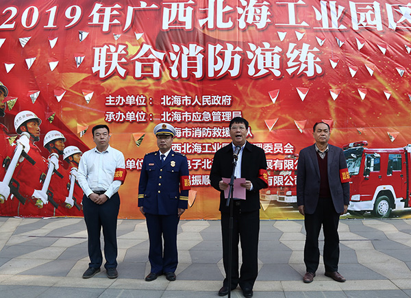 北海市委常委、常務(wù)副市長陳維致辭并宣布消防演練正式開始